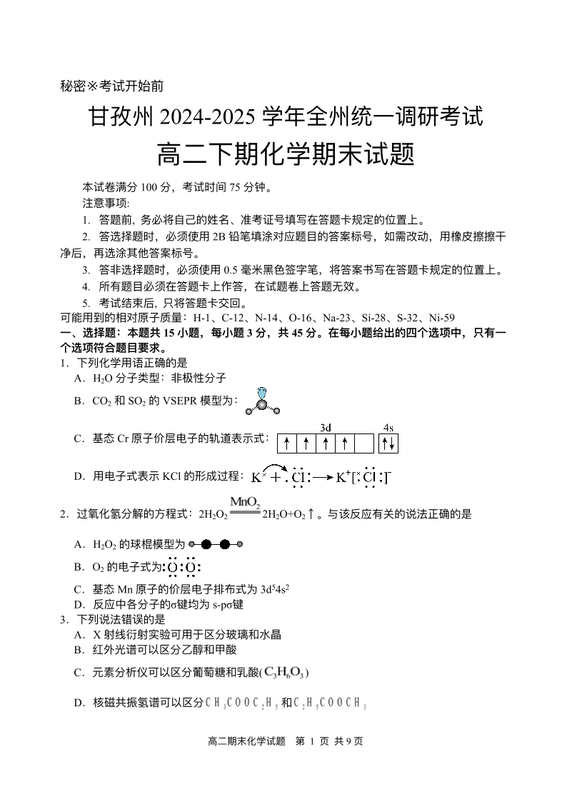 高二化学+答案--四川省甘孜藏族自治州2024-2025学年高二下学期7月期末全州统一调研考试