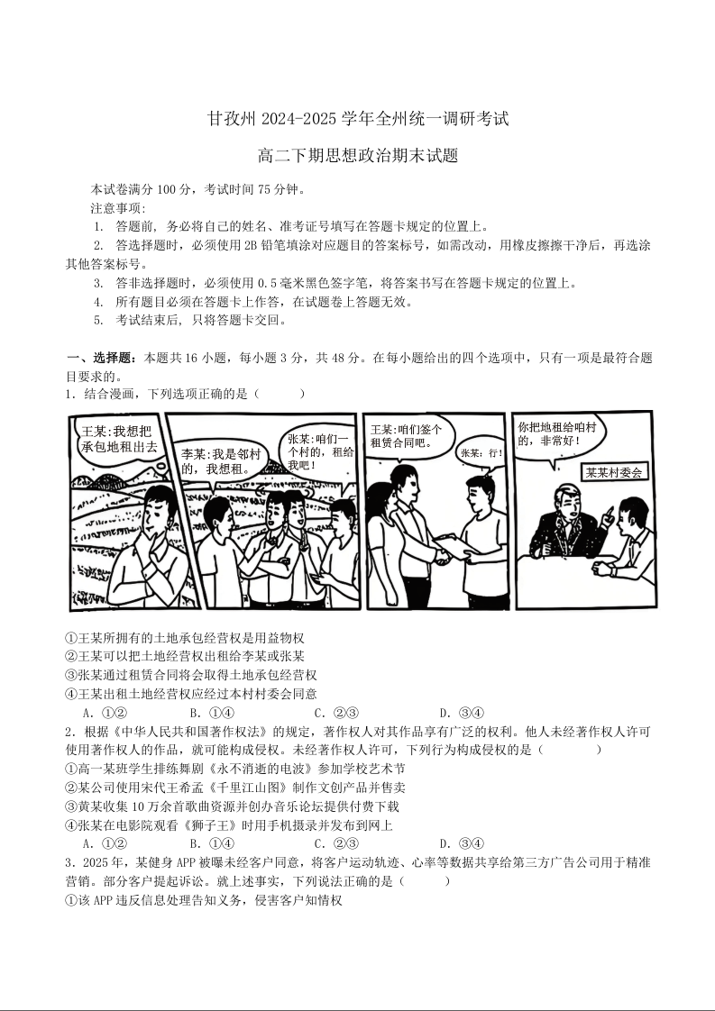 高二政治+答案--四川省甘孜藏族自治州2024-2025学年高二下学期7月期末全州统一调研考试