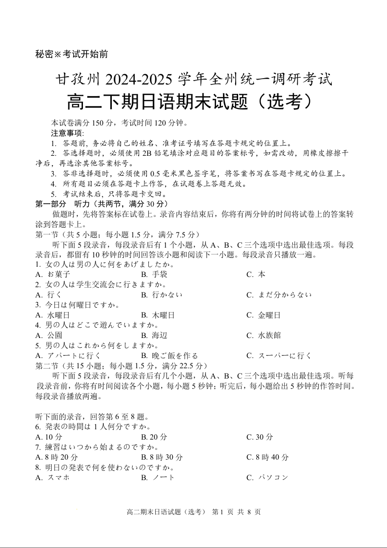 高二日语+答案--四川省甘孜藏族自治州2024-2025学年高二下学期7月期末全州统一调研考试