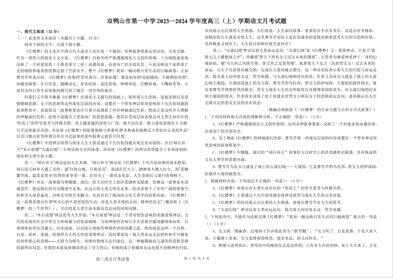 黑龙江省双鸭山市第一中学2024届高三上学期10月语文