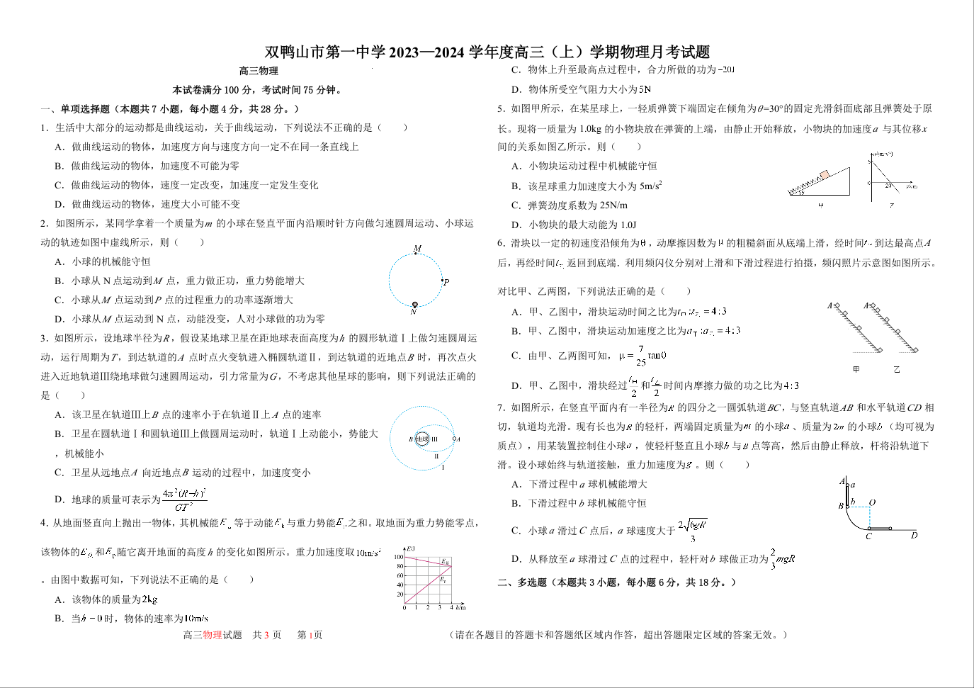 黑龙江省双鸭山市第一中学2024届高三上学期10月物理