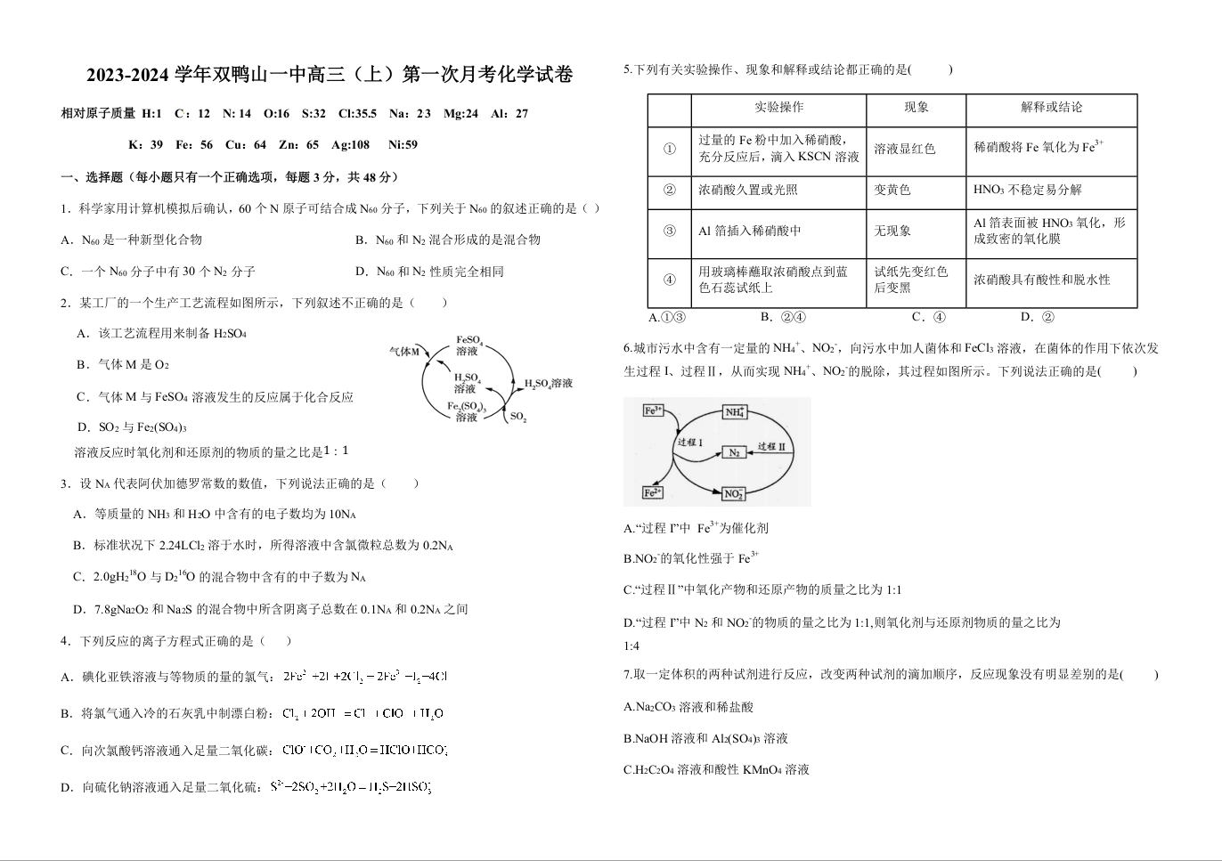 黑龙江省双鸭山市第一中学2024届高三上学期10月化学