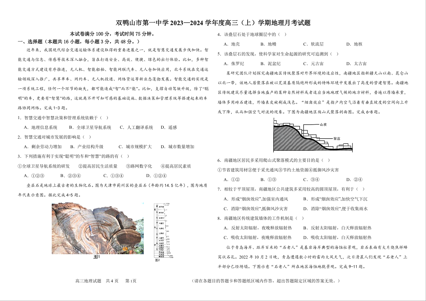 黑龙江省双鸭山市第一中学2024届高三上学期10月地理