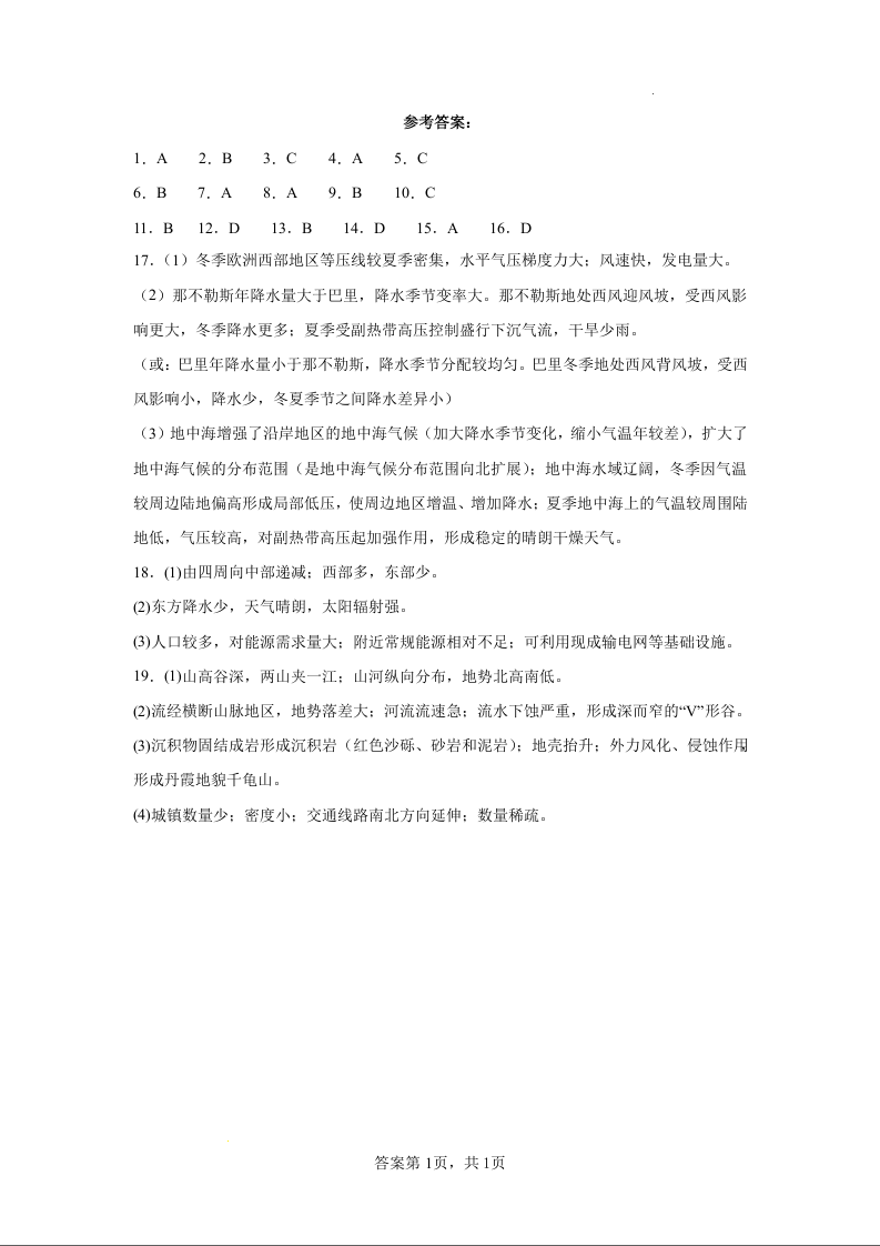 黑龙江省双鸭山市第一中学2024届高三上学期10月地理答案