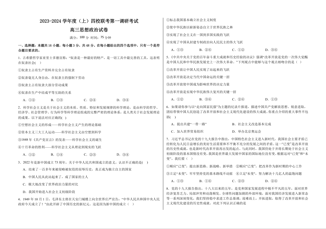 黑龙江省佳木斯高中教学联合体2024届高三上学期10月月考政治