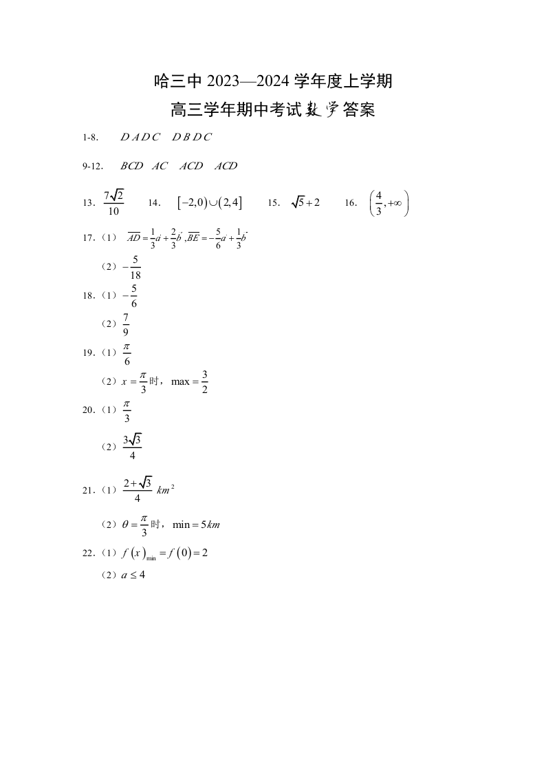 黑龙江省哈尔滨市第三中学校2024届高三上学期期中考试数学答案