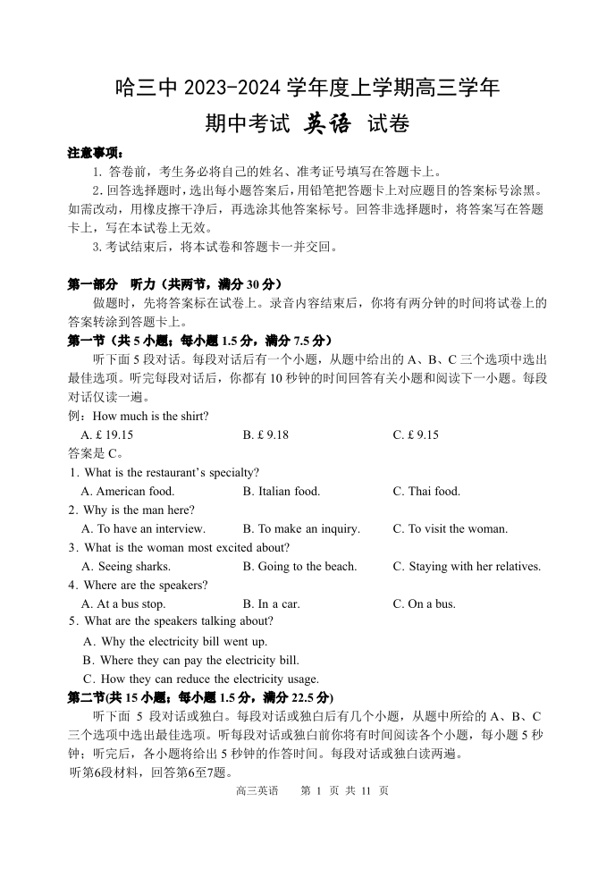 黑龙江省哈尔滨市第三中学校2024届高三上学期期中考试英语