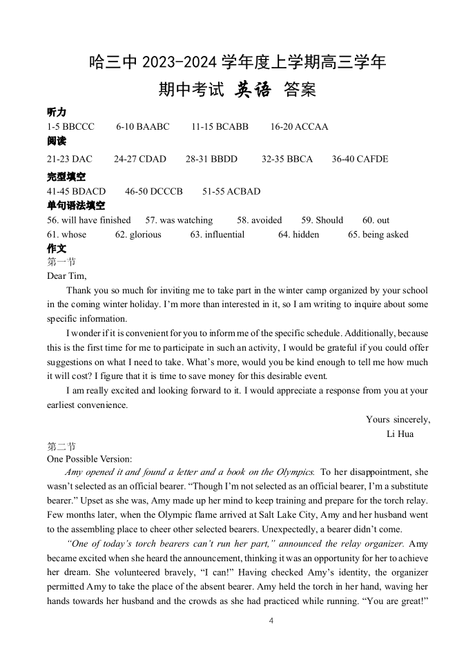 黑龙江省哈尔滨市第三中学校2024届高三上学期期中考试英语答案