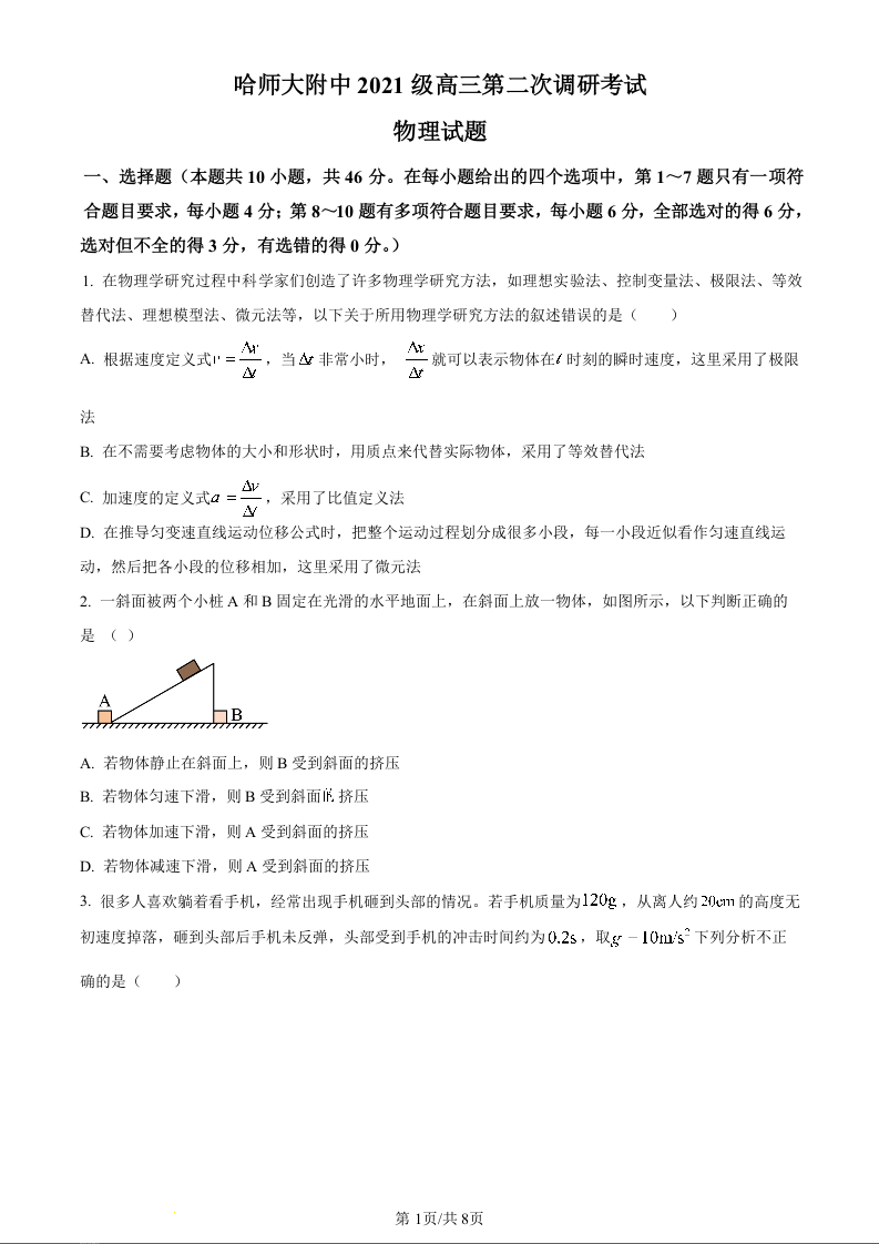 黑龙江省哈尔滨师范大学附属中学2024届高三上学期第二次调研考试物理(原卷版)