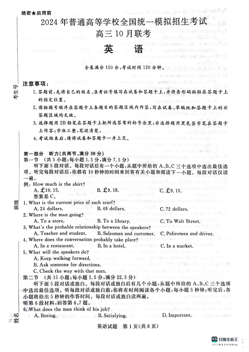河北省金科大联考2024届高三上学期10月联考英语+答案