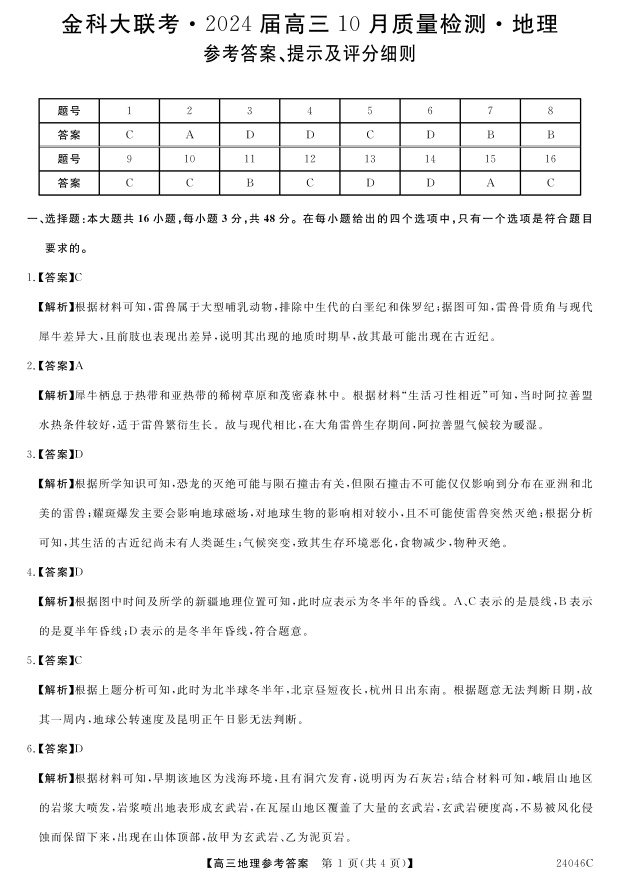 河北省金科大联考2024届高三上学期10月联考地理答案