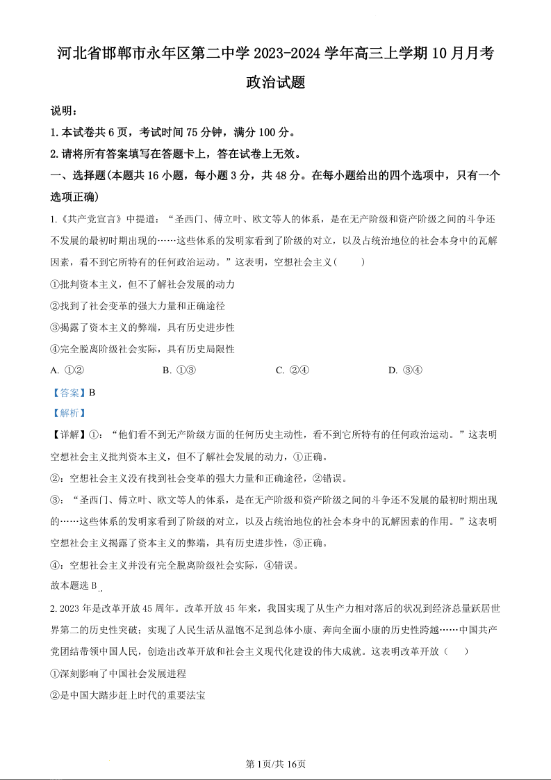 河北省邯郸市永年区第二中学2024届高三上学期10月月考政治(精品解析版)