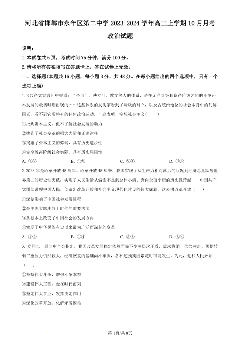 河北省邯郸市永年区第二中学2024届高三上学期10月月考政治(原卷版)