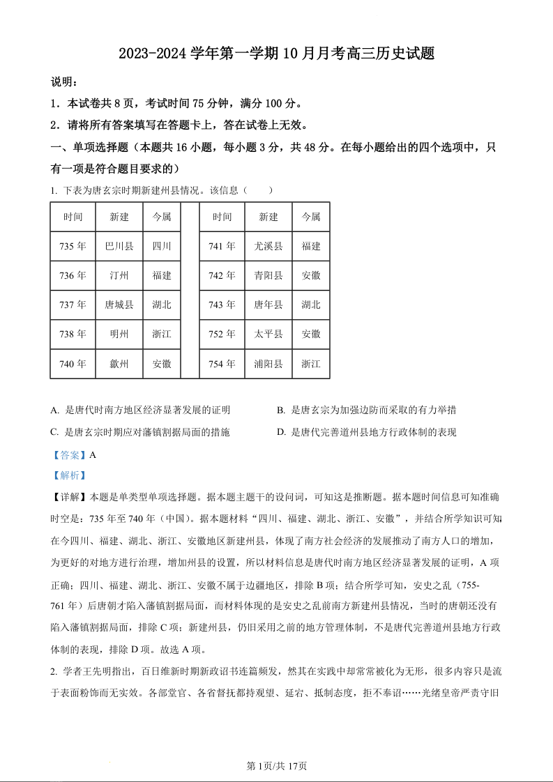河北省邯郸市永年区第二中学2024届高三上学期10月月考历史(解析版)