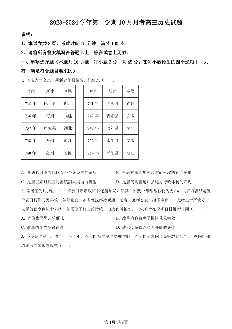 河北省邯郸市永年区第二中学2024届高三上学期10月月考历史(原卷版)