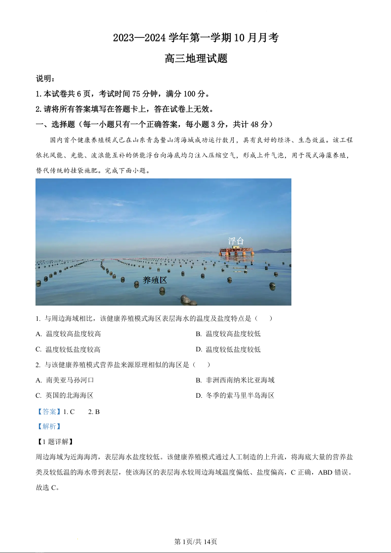 河北省邯郸市永年区第二中学2024届高三上学期10月月考地理(精品解析版)