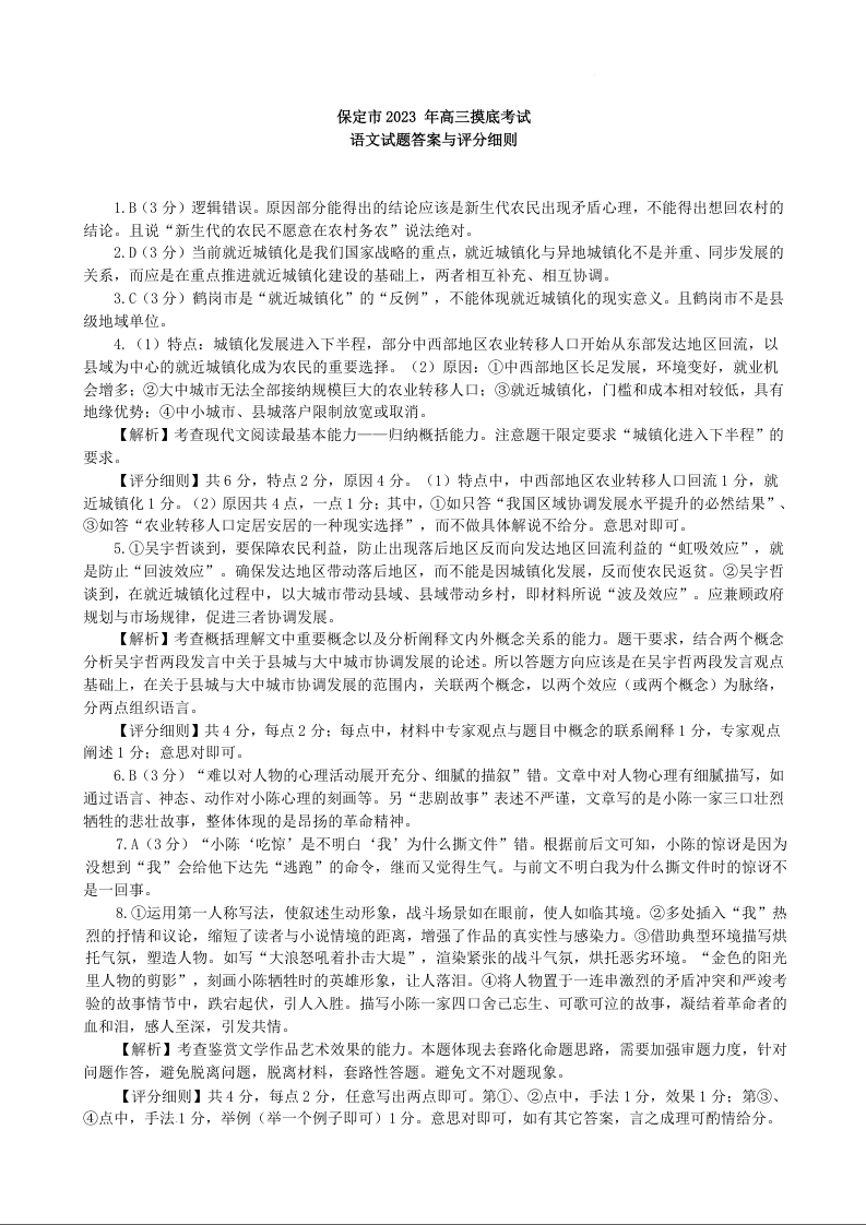 河北省保定市2024届高三上学期摸底考试(期中考试)语文答案