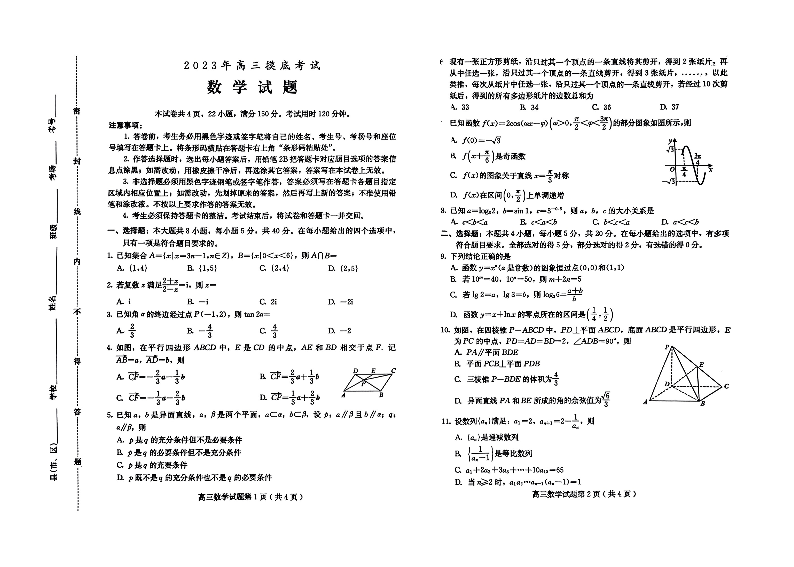 河北省保定市2024届高三上学期摸底考试(期中考试)数学