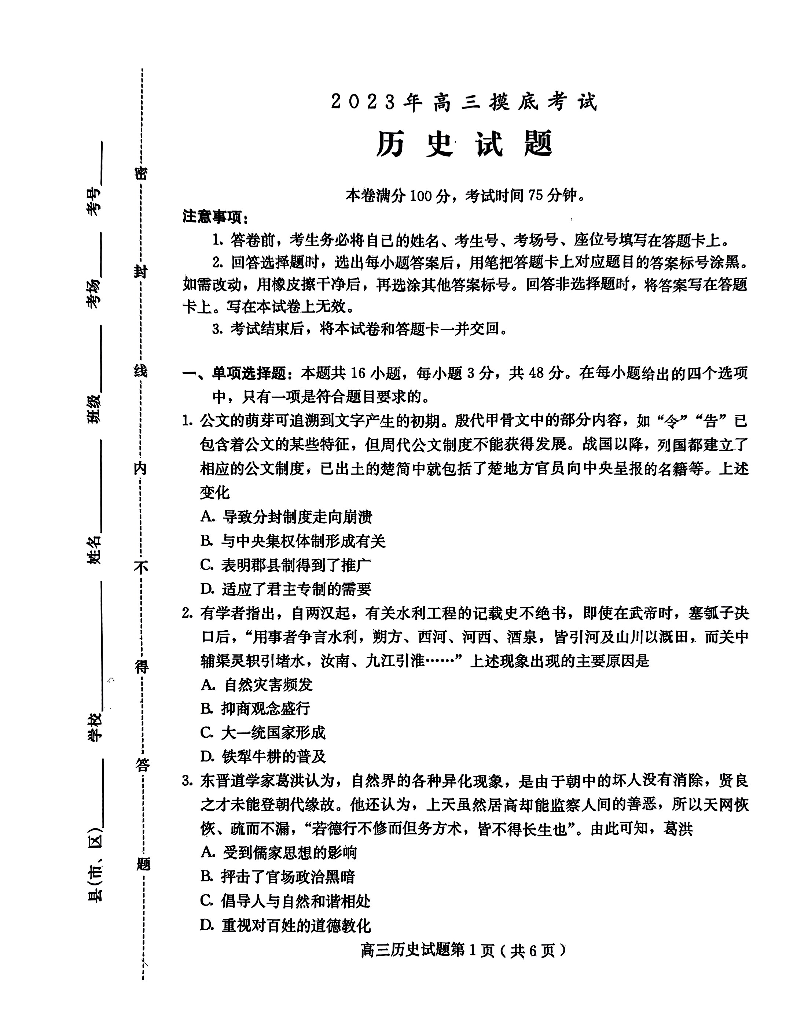河北省保定市2024届高三上学期摸底考试(期中考试)历史
