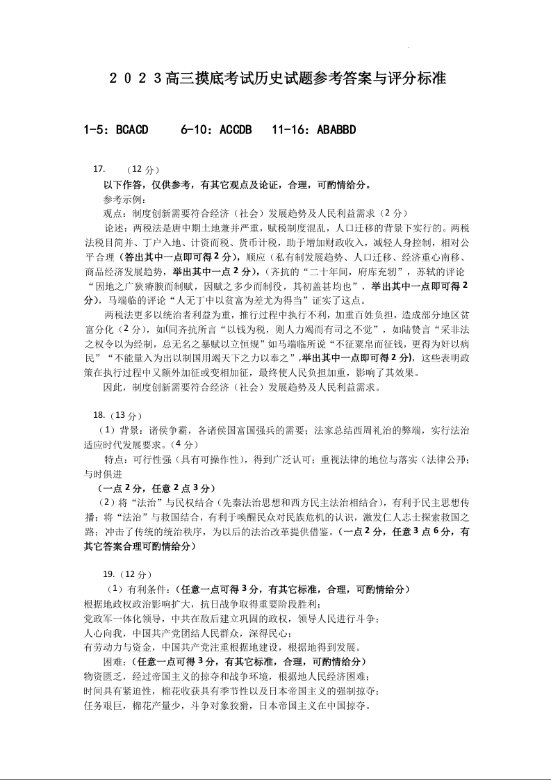 河北省保定市2024届高三上学期摸底考试(期中考试)历史答案