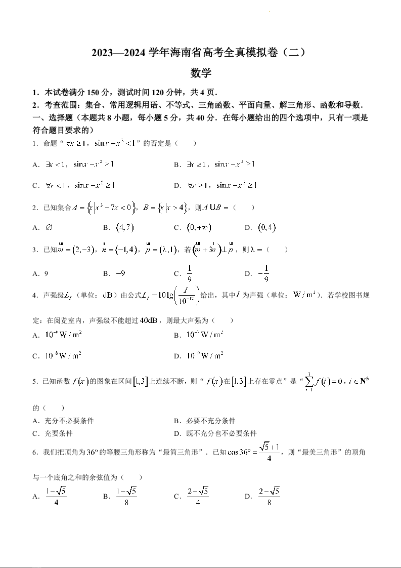 海南省2024届高考全真模拟卷(二)数学+答案