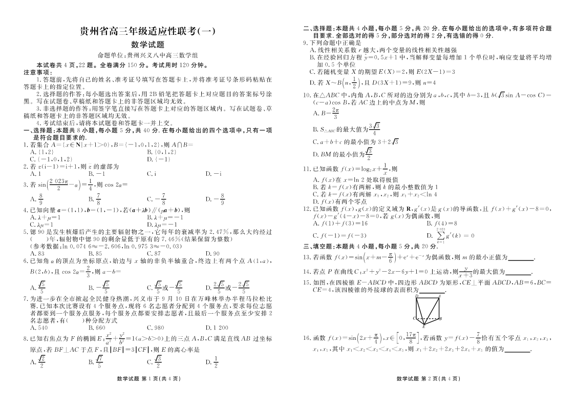 贵州省2024届高三上学期适应性联考(一)数学