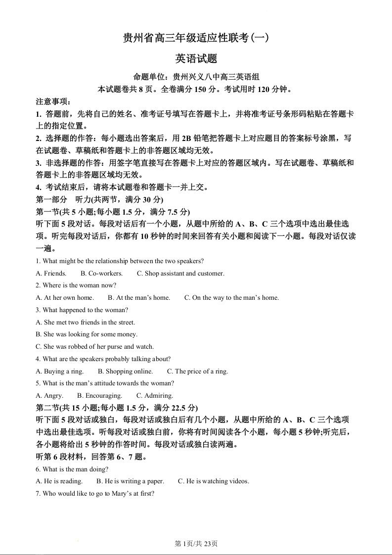 贵州省2024届高三上学期适应性联考(一)英语(解析版)