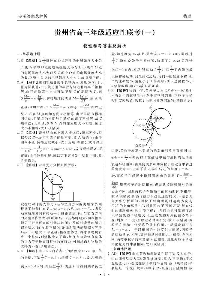 贵州省2024届高三上学期适应性联考(一)物理答案