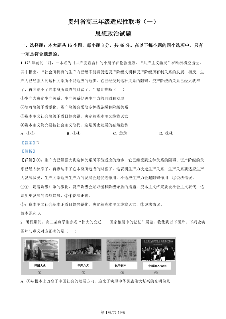 贵州省2024届高三上学期适应性联考(一)(精品解析版)政治