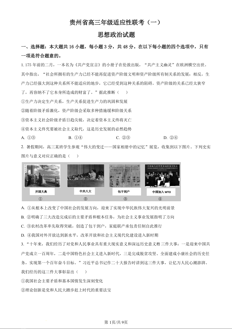 贵州省2024届高三上学期适应性联考(一)(原卷版)政治