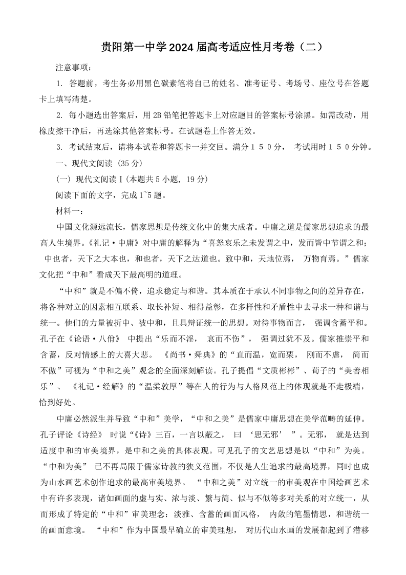 贵州省贵阳市第一中学2024届高三上学期高考适应性月考(二)语文