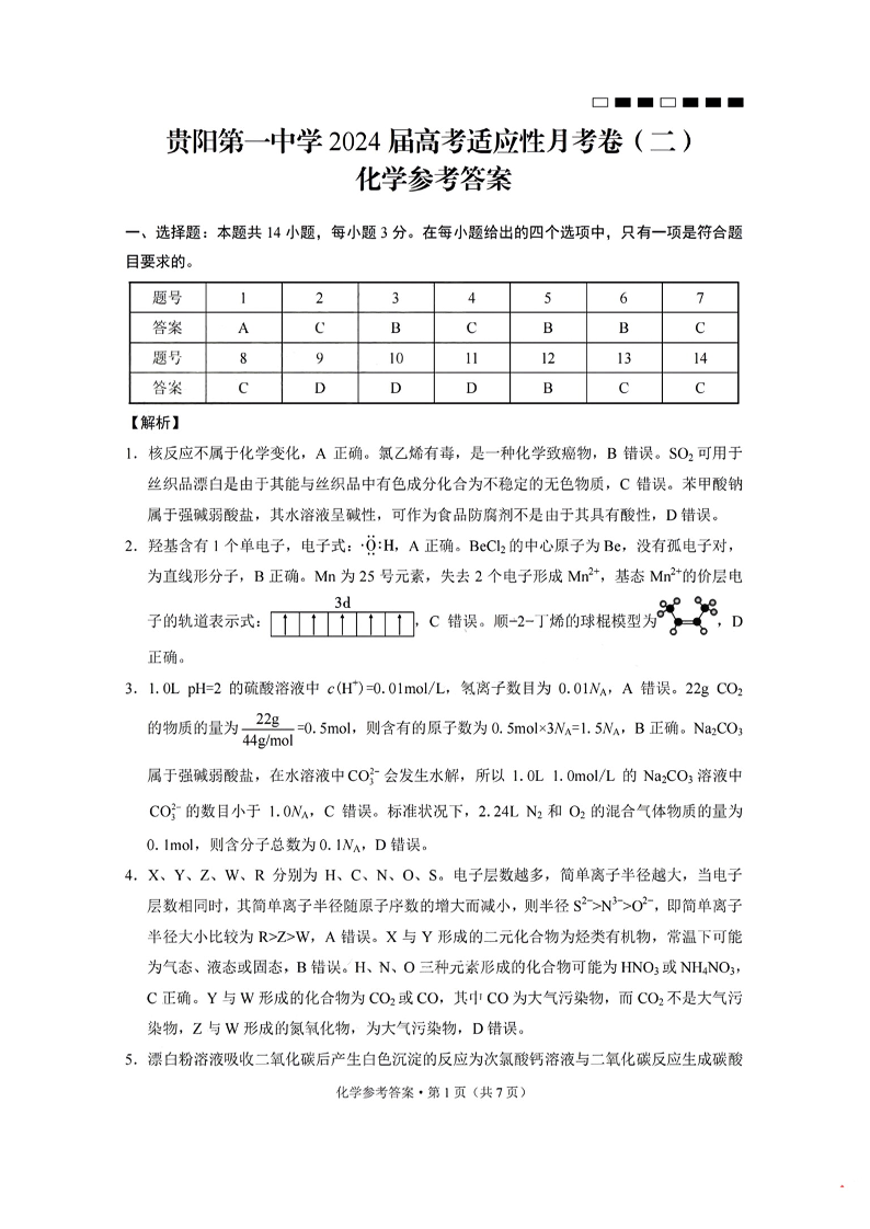 贵州省贵阳市第一中学2024届高三上学期高考适应性月考(二)化学答案