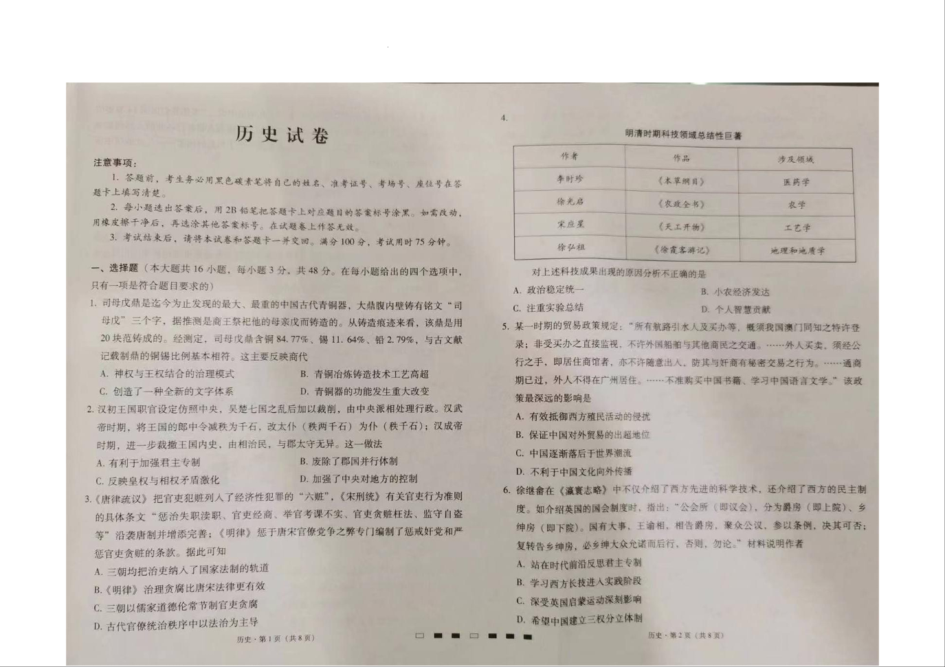 贵州省贵阳市第一中学2024届高三上学期高考适应性月考(二)历史