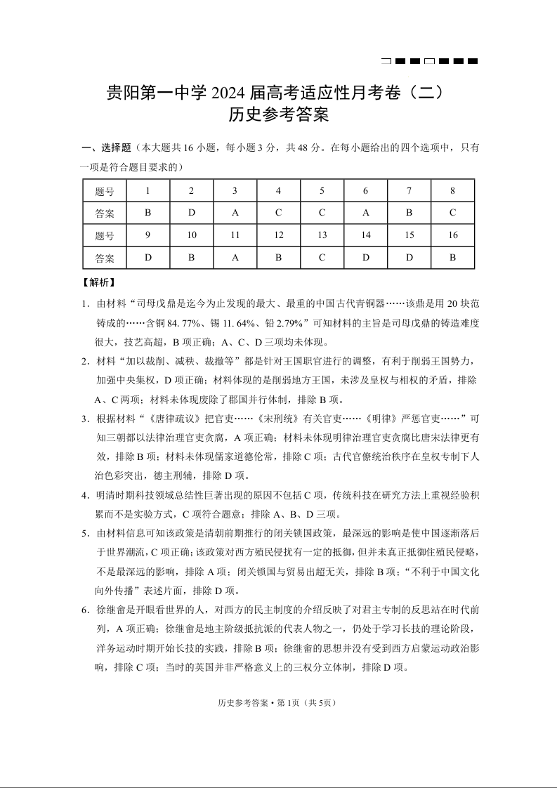 贵州省贵阳市第一中学2024届高三上学期高考适应性月考(二)历史答案