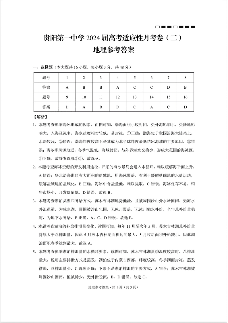 贵州省贵阳市第一中学2024届高三上学期高考适应性月考(二)地理答案