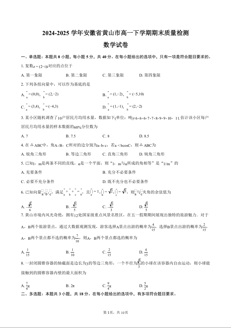 高一数学+答案--安徽省黄山市2024-2025学年高一下学期期末考试