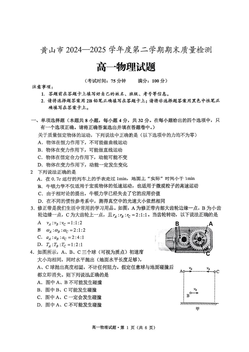 高一物理--安徽省黄山市2024-2025学年高一下学期期末考试