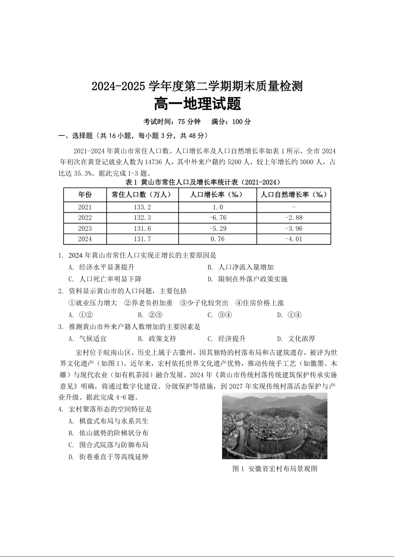 高一地理+答案--安徽省黄山市2024-2025学年高一下学期期末考试