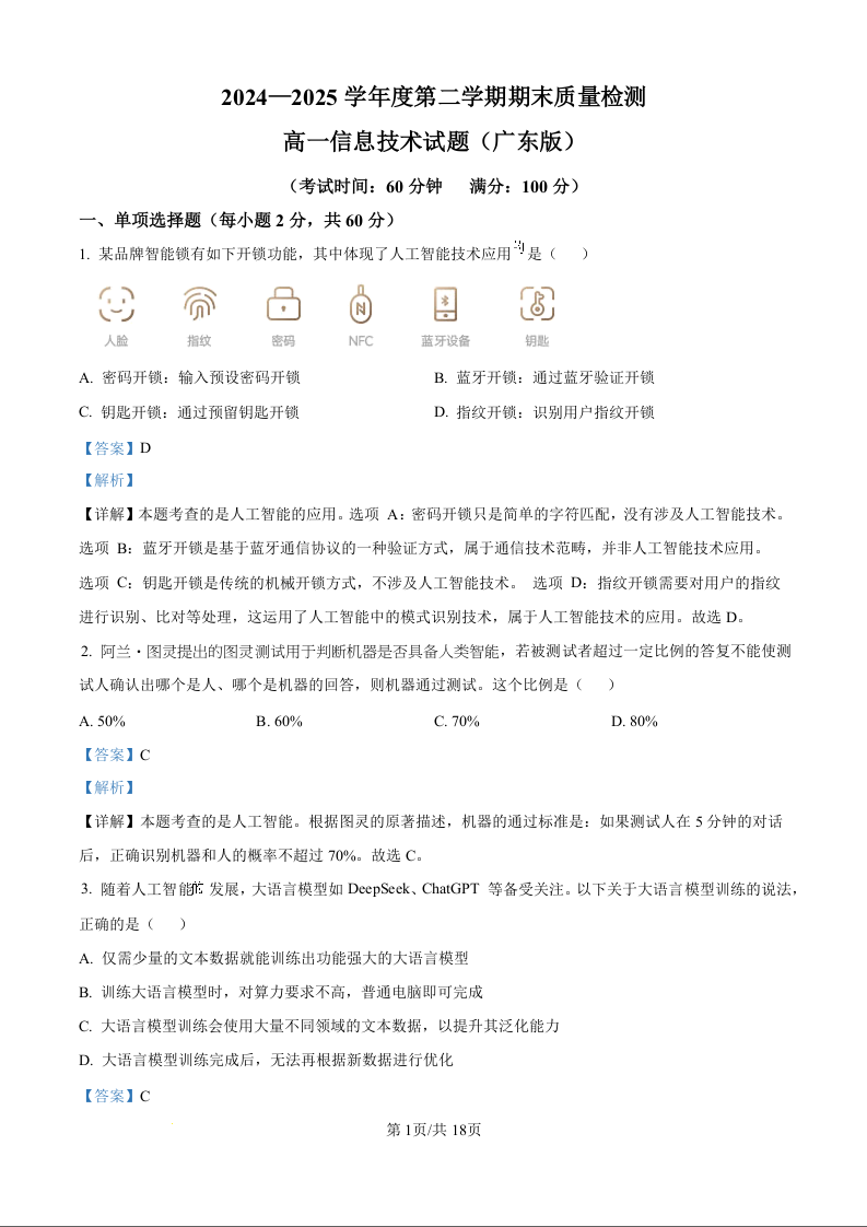 高一信息技术(解析版)--安徽省黄山市2024-2025学年高一下学期期末考试