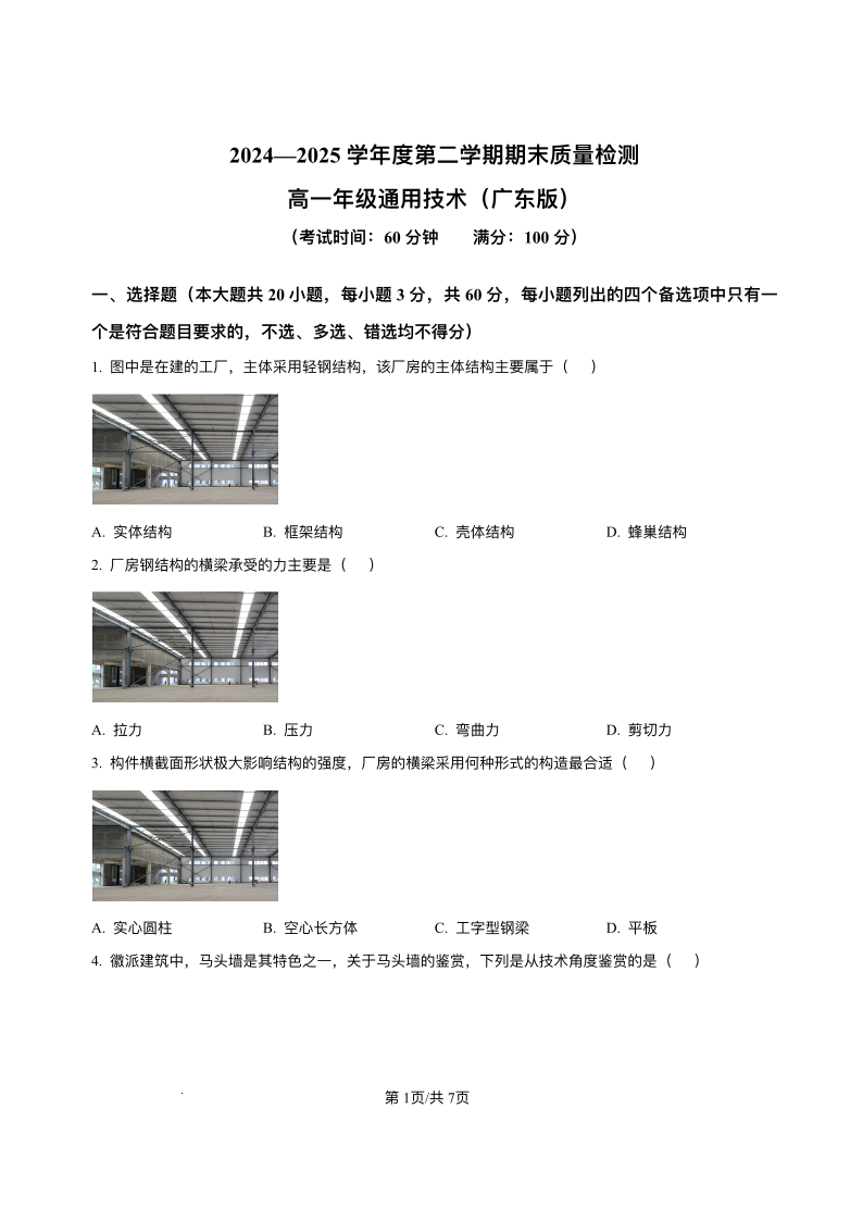 高一通用技术+答案--安徽省黄山市2024-2025学年高一下学期期末考试