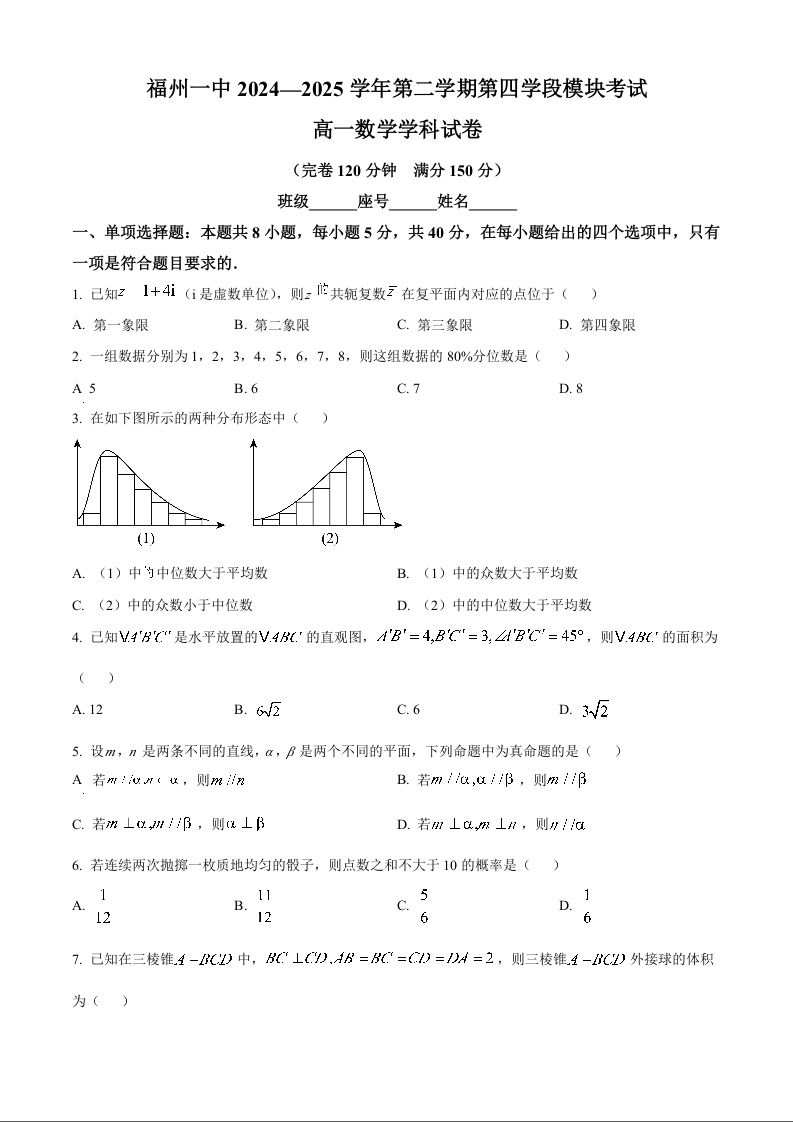 高一数学+答案--福建省福州第一中学2024-2025学年高一下学期7月期末考试