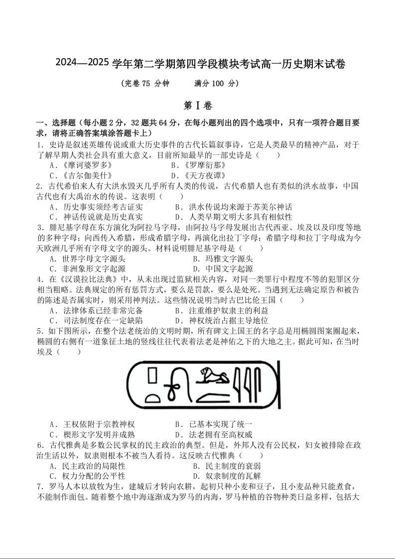 高一历史+答案--福建省福州第一中学2024-2025学年高一下学期7月期末考试