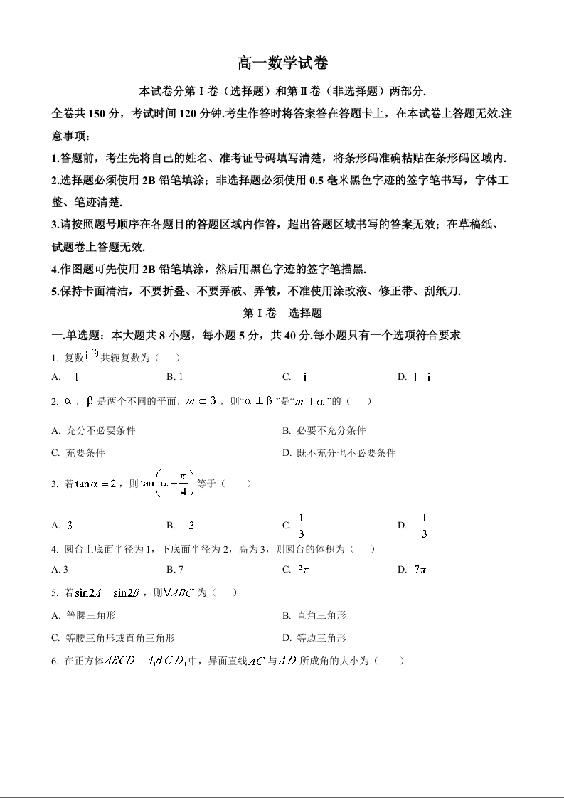 高一数学+答案--黑龙江省黑河市龙西北名校联盟2024-2025学年高一下学期7月期末考试