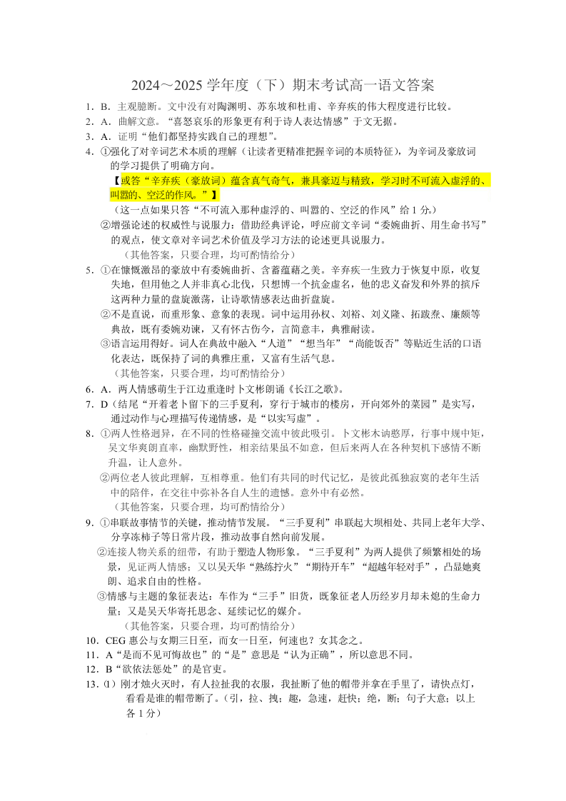高一语文答案--辽宁省丹东市2024-2025学年高一下学期期末教学质量监测