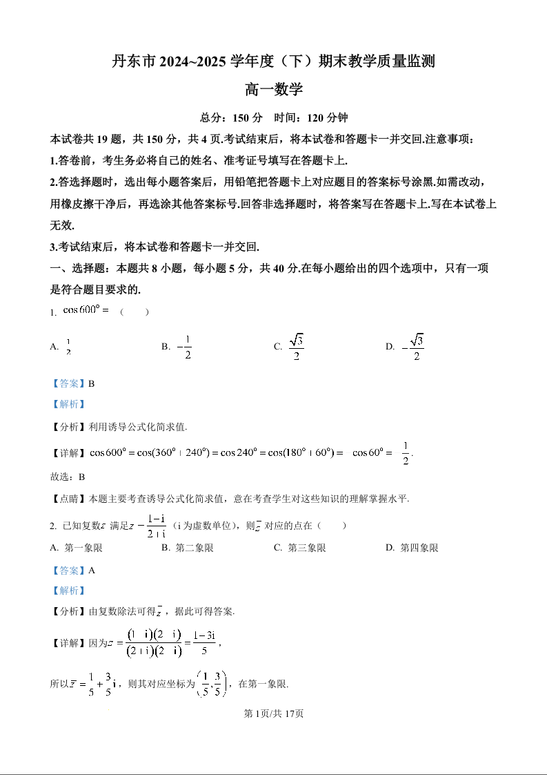 高一数学(解析版)--辽宁省丹东市2024-2025学年高一下学期期末教学质量监测