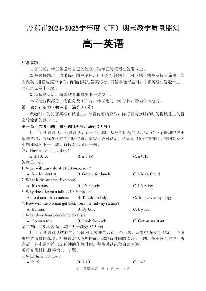 高一英语+答案--辽宁省丹东市2024-2025学年高一下学期期末教学质量监测