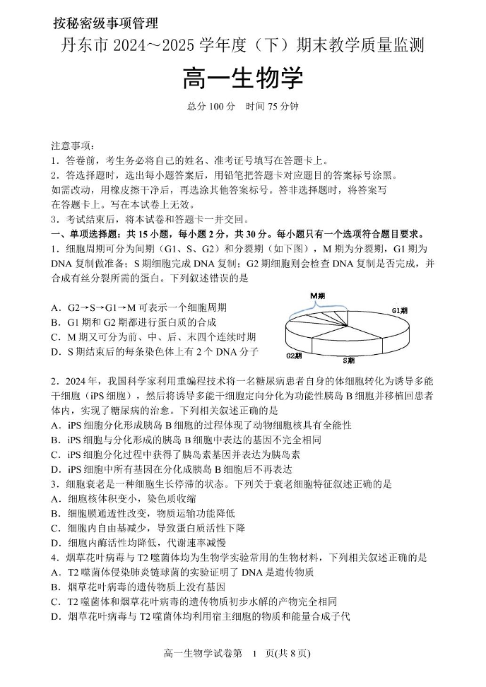 高一生物--辽宁省丹东市2024-2025学年高一下学期期末教学质量监测