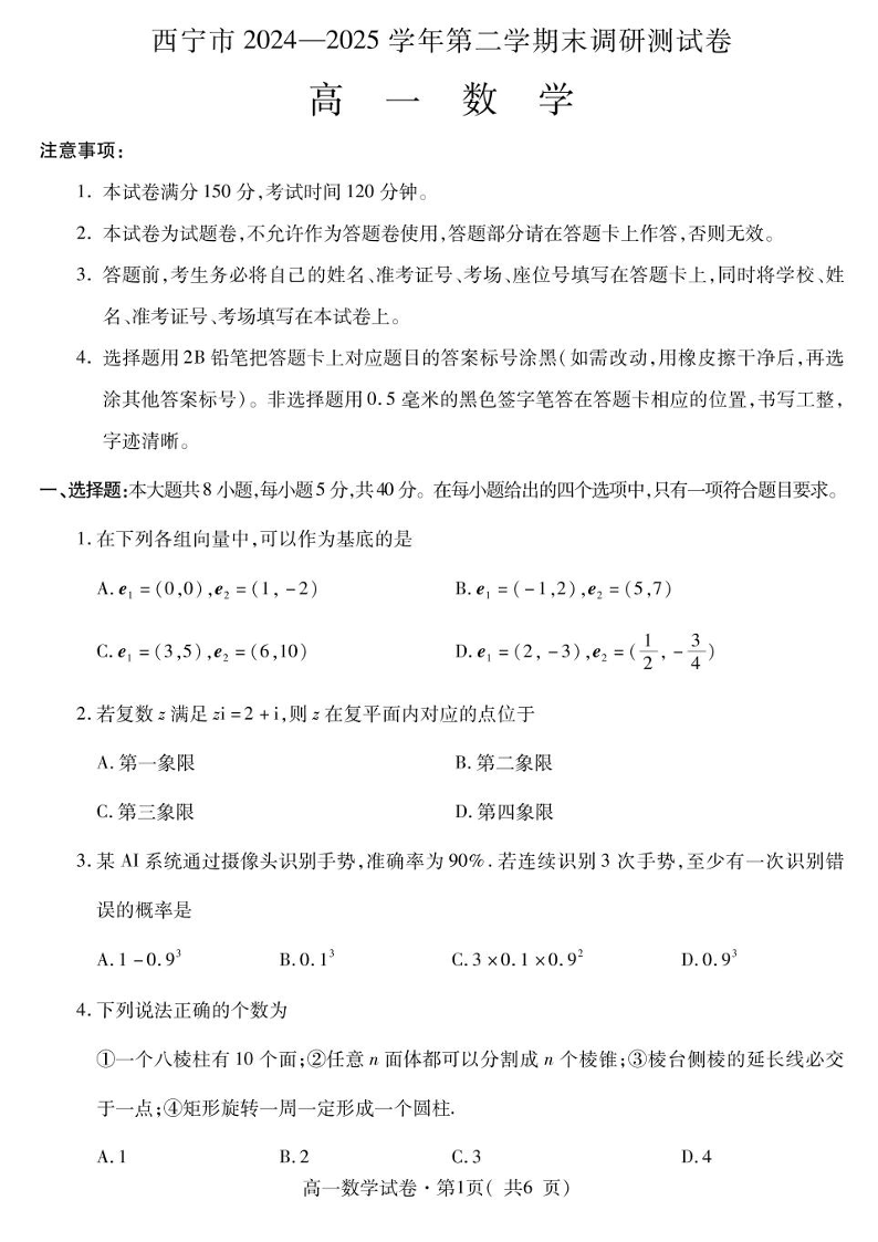 高一数学+答案--青海省西宁市2024-2025学年高一下学期末调研测试