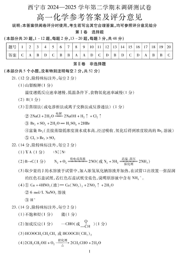高一化学答案--青海省西宁市2024-2025学年高一下学期末调研测试