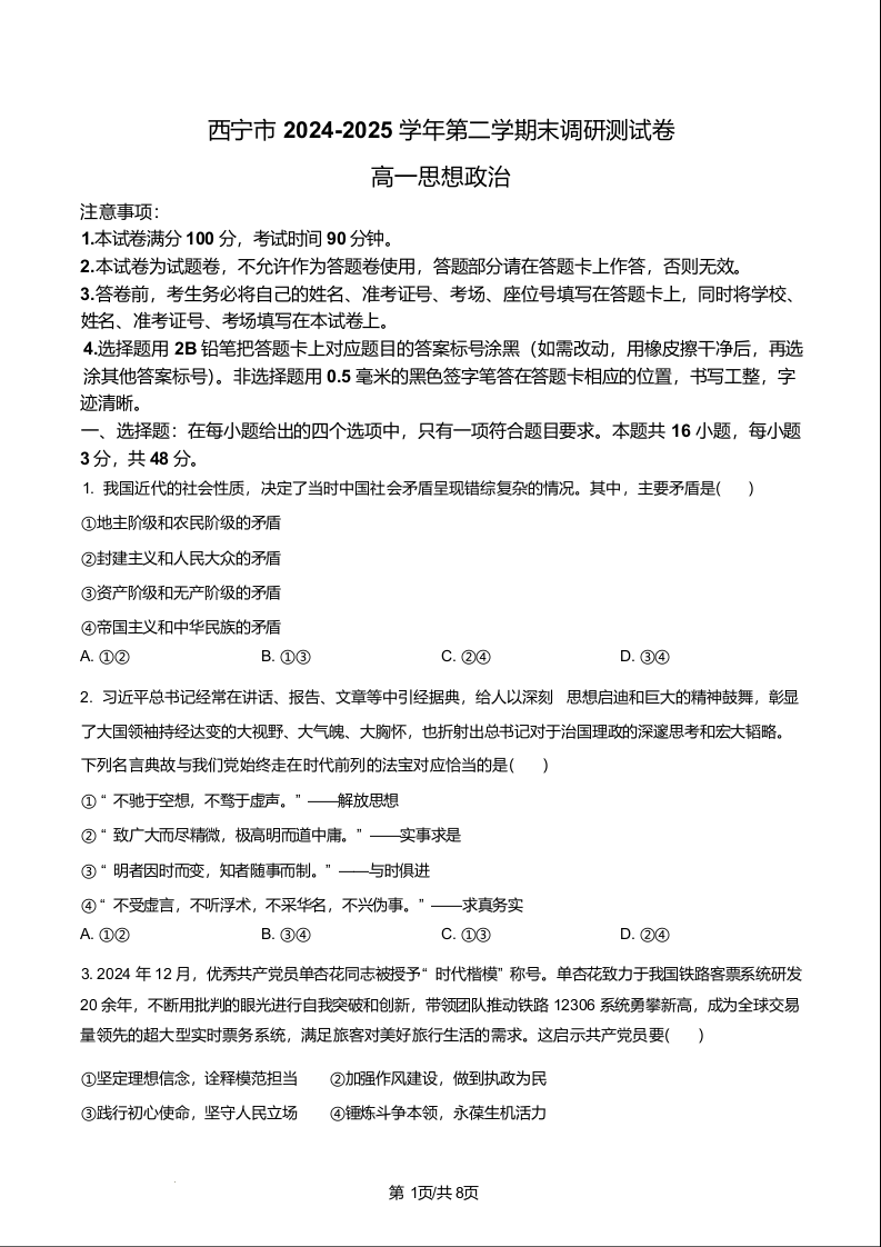 高一政治+答案--青海省西宁市2024-2025学年高一下学期末调研测试